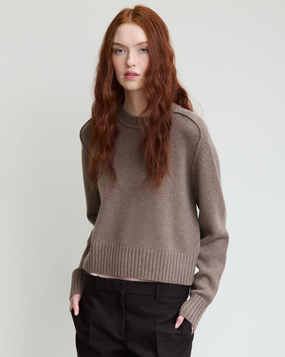 A luxurious and warm 3 gauge cashmere knit, with exposed seam detailing at the shoulders. The fit is relaxed but not oversized, and the length works perfectly with today's higher waisted bottoms.